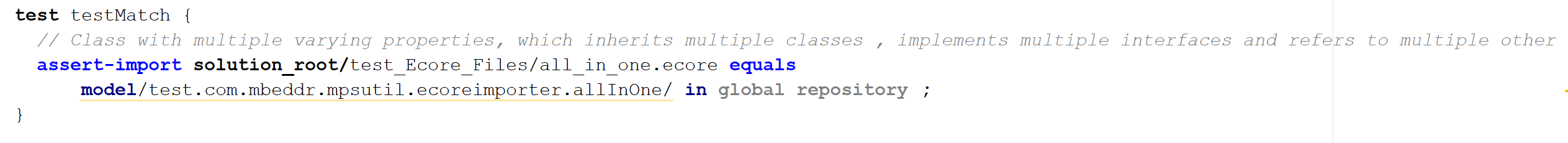 - The first language extension allows testers to specify the metamodel file in EMF(ecore/xcore file) and the expected metamodel. These are then used by the testing runtime to invoke the metamodel importer and assert if the imported metamodel and the expected metamodel are equal. This internally uses the MPS Node Comparator framework.