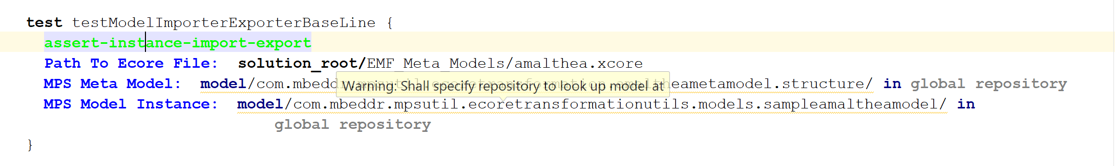 - The second language extension allows testers to simultaneously test the model-importer and model-exporter. The tester simply needs to specify the two metamodels (MPS language and EMF ecore file) and the model instance to be tested. The testing framework internally uses the model-exporter to export this model as an XML file, store it in a temporary location, then use the model-importer to import this xml file as a temporary model and finally assert if the imported model and the original model are equal using the MPS Node Comparator.